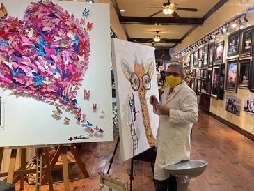 Bright colors, he mixes oil paint and acrylic paint, he uses resin to give volume, framed or unframed, his works are loved by clients looking for something unique. Even if you are just curious, your look shall stop a few instants to contemplate these compositions