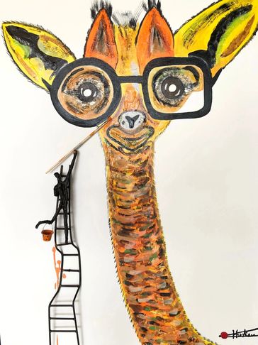 This giraffe with my glasses is a painting made with acrylic and resin . A bronze sculpture in 3D represents a painter painting on the ladder. The size is 48"x36" but I accept special orders to 72"x48" Send me an e-mail for a quote.
